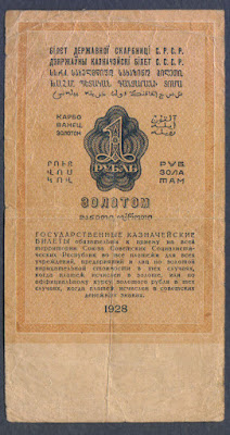 The Rouble was once again revalued when this banknote was printed. This particular note, printed in 1928 by the Soviet Union, was pegged to the gold standard. The front of the banknote recognizes the value of the note as 1 Rouble worth of gold. The front fo the note has one of the earlier designs of the Soviet emblem, showing only a few banners around the main hammer and sickle design in front of the globe. The Soviet Union at the time only had 6 republics, each of which is represented by 1 banner. However, as seen in future banknotes, the number of banners (and, therefore, the number of republics and size of the Soviet Union) increased.
